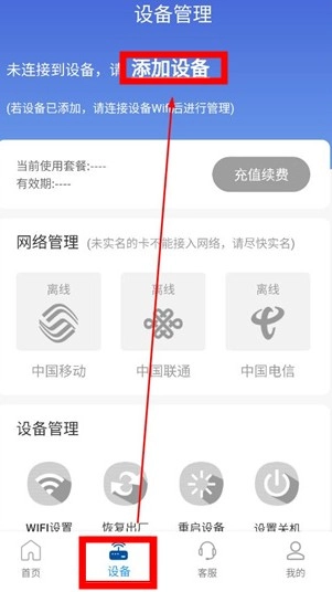 启动后,点击底部的设备菜单,选择“添加设备”选项,再点击“开始添加”按钮。