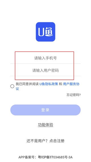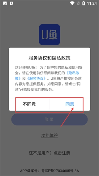 1、打开【U鱼】应用后,需要仔细阅读《隐私政策》和《服务协议》,并点击【同意】按钮以确认接受相关条款,之后方可继续使用该应用的各项服务与功能。