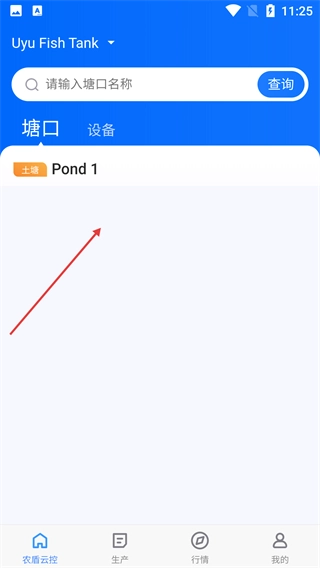 3、进入【农盾云控】主界面后,顶部支持搜索塘口名称,页面设有【塘口】【设备】两大分类,目前展示的是“Pond 1”土塘的相关信息。