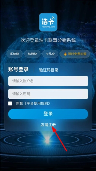 2、进入登录界面后,点击店铺注册选项,即可进入注册页面。