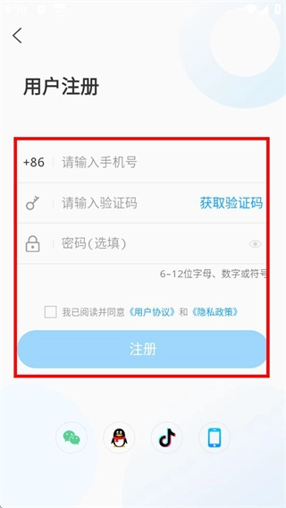 4、在用户注册页面,填写相关信息并勾选协议后,点击注册按钮即可完成注册流程。