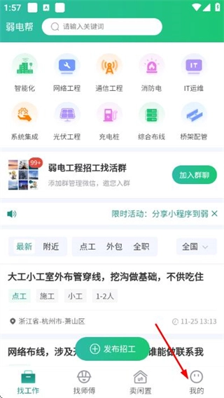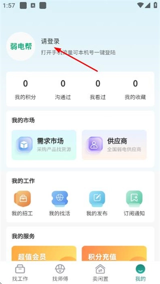 1、在弱电帮首页点击底部我的,进入我的页面。