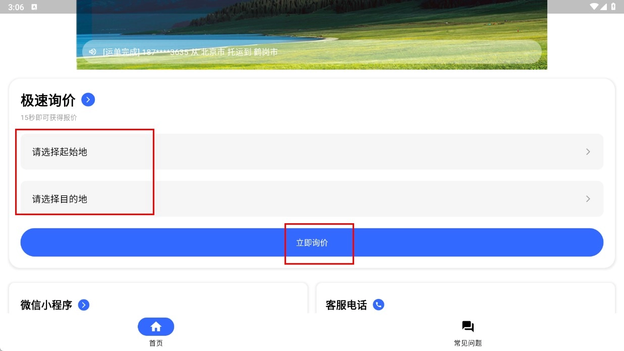 2、在首页的“极速询价”板块中,选定【起始地】与【目的地】后,点击【立即询价】按钮,即可得到车辆运输的报价。