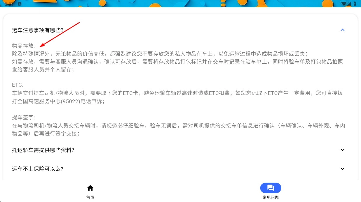 4、在常见问题页面,点击具体的问题(例如“运车有哪些注意事项?”),展开后查看详细说明,从而了解运车的规范和流程。