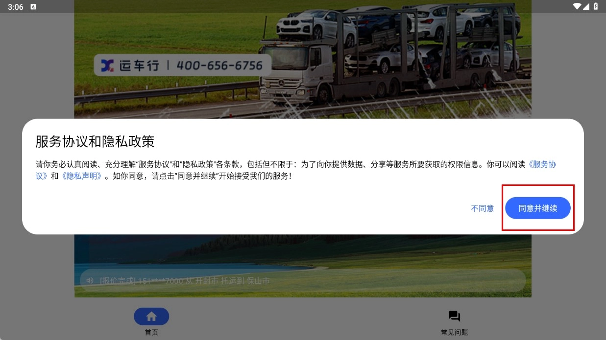 1、在弹出的服务协议与隐私政策窗口中,点击【同意并继续】按钮,确认同意相关条款后,即可进入运车行的主界面。