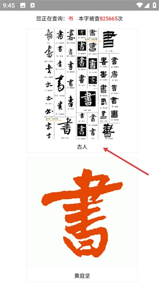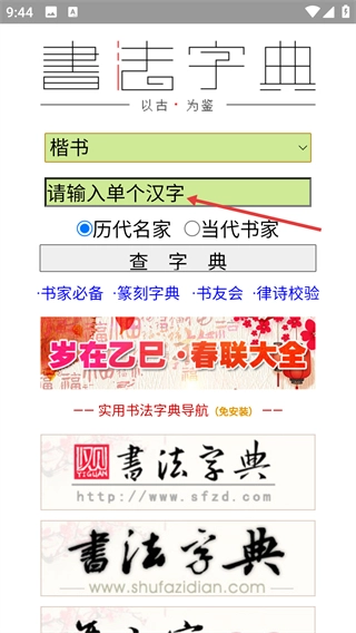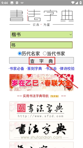 3、选择“历代名家”或“当代书家”选项后,点击【查字典】按钮,即可获取该汉字的书法字体范例。