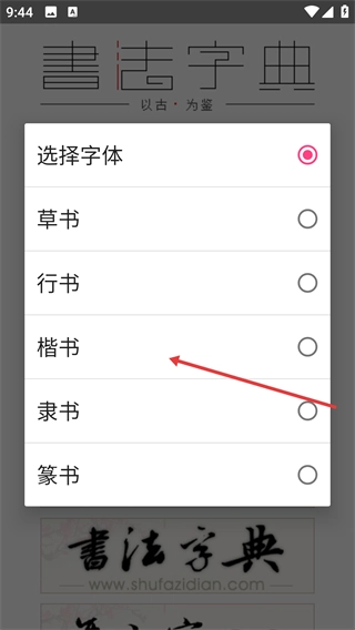 1、打开字体选择弹窗,挑选想要的书法字体(比如“楷书”),确认选择后即可进入查询页面。