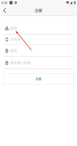 4、进入注册页面后,找到昵称、手机号等信息对应的输入栏,按顺序填写好各项内容,之后点击注册按钮就能完成账号注册流程。