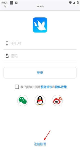 3、进入登录界面后,会看到手机号密码输入区域以及第三方登录的图标,此时点击“注册账号”选项,即可进入账号注册的信息填写页面。